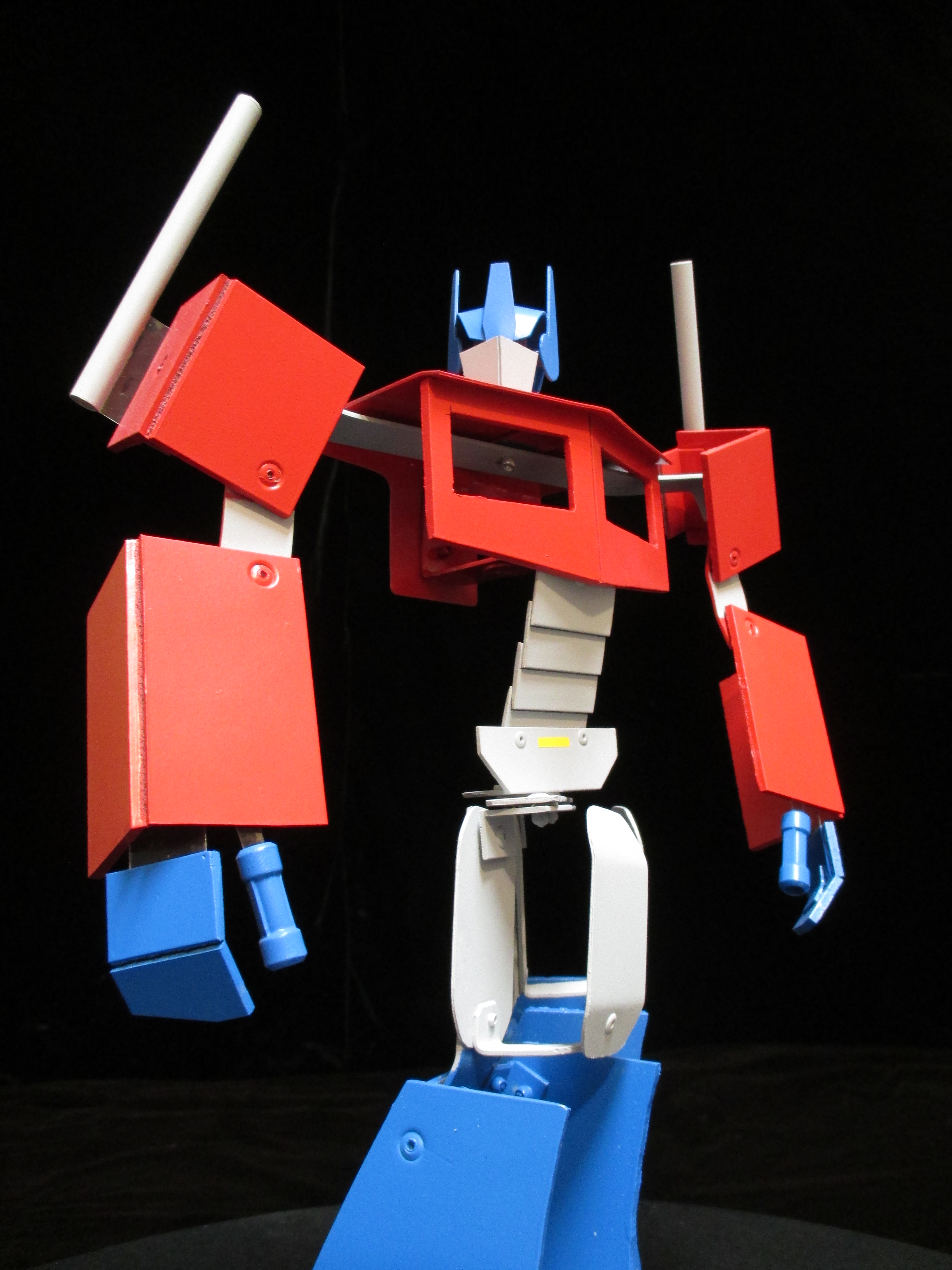 Abstract "Prime" was the first in the series of my new Transformers "Abstract" line of 100% scratch-built posable figures in August 2013. The object was to make a recognizable figure using very basic components and colors. The materials used was a combination of pvc & styrene-sheeting, aluminum flatbar, clear plastic sheeting and rivets. Prime stands at 17" tall and has 20-points of articulation, and comes with a magnetically-attached "Matrix of Leadership" that can either be held, placed inside his chest or on the back of his right arm. Check out Prime's YouTube video here & subscribe! |
